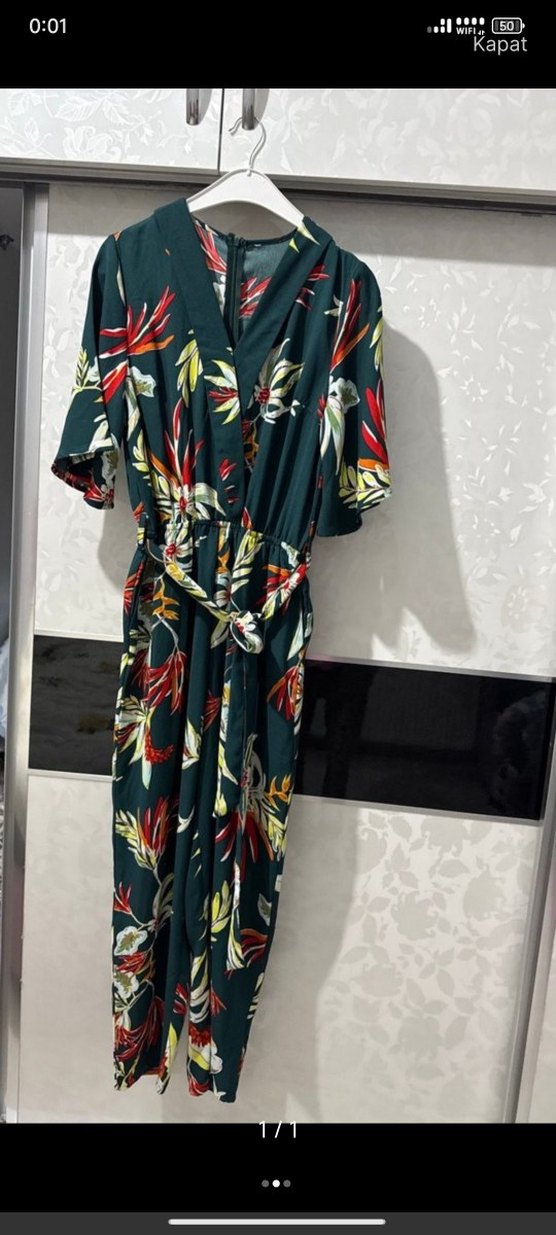 Bohem tarzda, kısa kollu ve V yakalı, sentetik kumaştan yapılmış, desenli ve bol kesim uzun tulum. Günlük kullanıma uygun, drapeli tasarım.