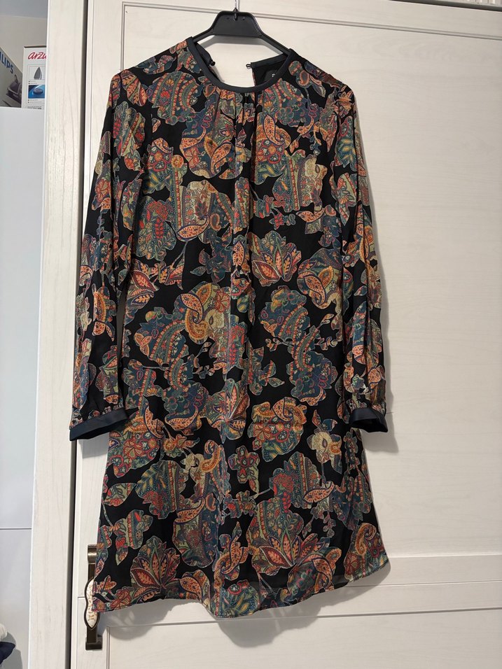 Çok renkli bohem desenli, drapeli, günlük kullanıma uygun. Şık elbise.xs bedendir 38-36 beden arası iken giydim.Bir kere giyilmiştir surumu gayet iyi.şifon kumaş astarı vardır.