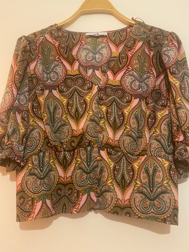 Renkli bohem desenli, kısa kollu, yuvarlak yakalı, düğmeli ve bol kesim kadın bluz.