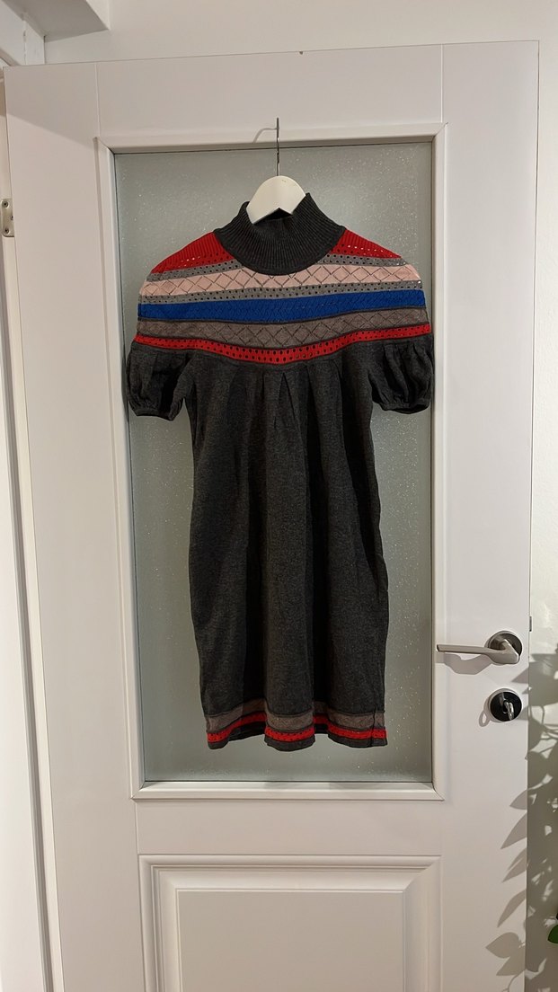 Bohem tarzı, yüksek yakalı ve kısa kollu, desenli triko elbise ve tunik. Uzun boyu ve rahat kumaşı günlük kullanıma uygundur.