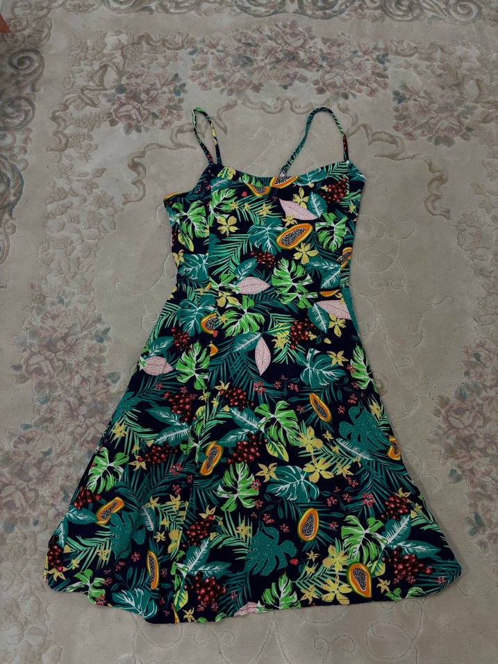 Renkli desenlere sahip, ince askılı ve fırfırlı detaylı, vücuda oturan midi elbise. Yumuşak sentetik kumaştan yapılmış, bohem tarzını yansıtıyor.