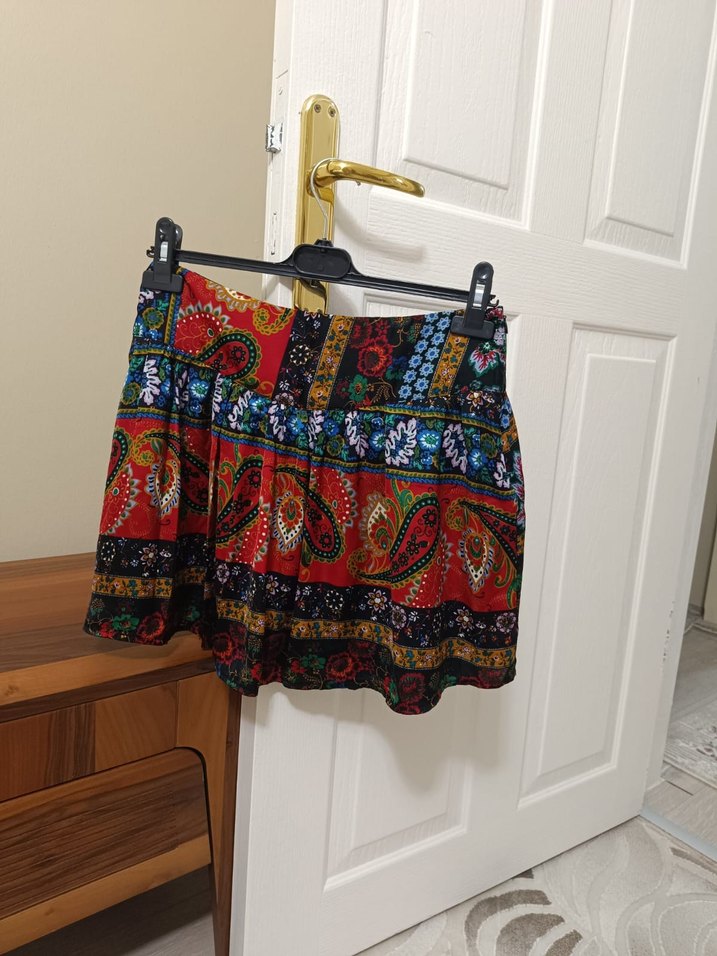 Desenli, bol kesim ve drapeli bohem mini etek, canlı çok renkli kumaştan, günlük kullanım için uygun.boyu 40 cm bel 36-37 cm