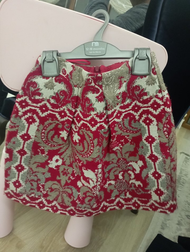 Kırmızı ve gri desenli örme kumaştan, bol kesim vintage bohem tarzda mini etek, günlük kullanım için uygundur.