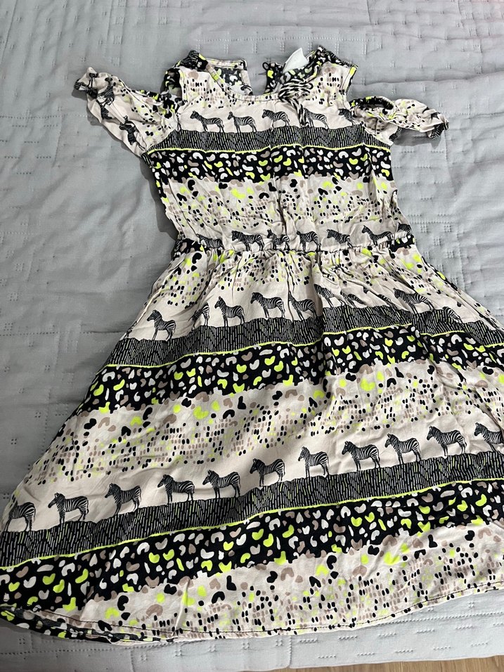 Desenli, bohem tarzda, kısa kollu, straplez ve drapeli kadın elbisesi. Yumuşak sentetik kumaş üzerine zebra desenli çok renkli tasarım içerir.