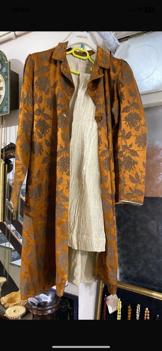 Desenli, bol kesim ve yakalı uzun kadın kaban. Gri ve bej tonlarında, ofis için uygun bohem tarzda bir tasarım.