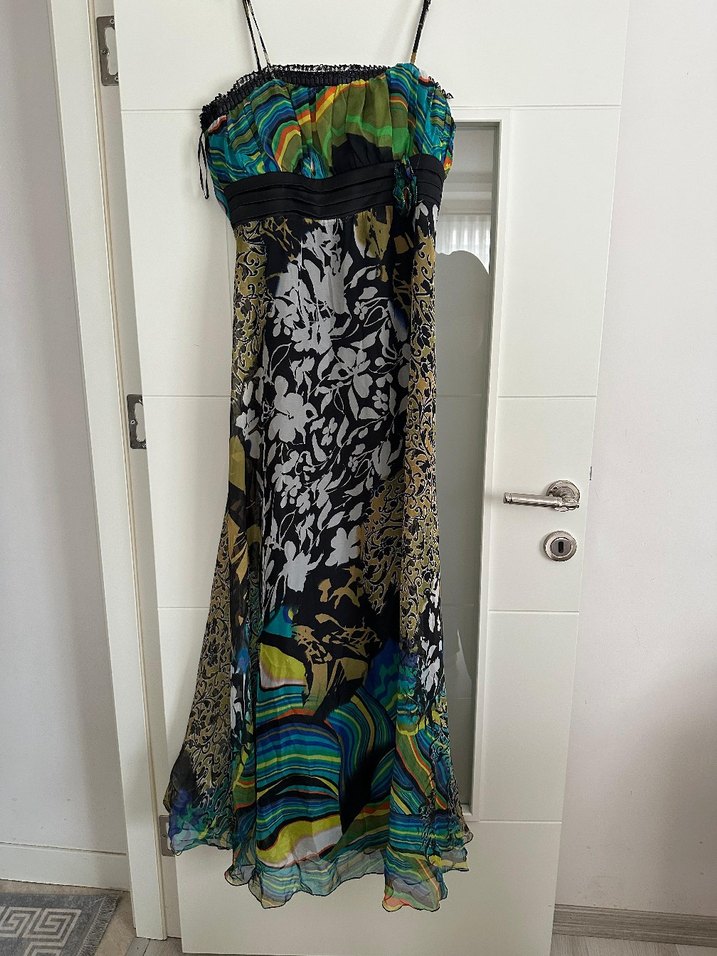 Bu oturan, askılı uzun elbise koyu renkli, çok desenli ve drapeli detaylara sahiptir. Sentetik kumaştan yapılmış olup, bohem tarzını yansıtır.