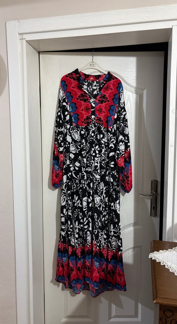 V yaka, uzun kollu, pileli kumaştan yapılmış bol kesim bohem desenli uzun elbise. Koyu ve çok renkli deseniyle günlük kullanıma uygundur. 140 cm