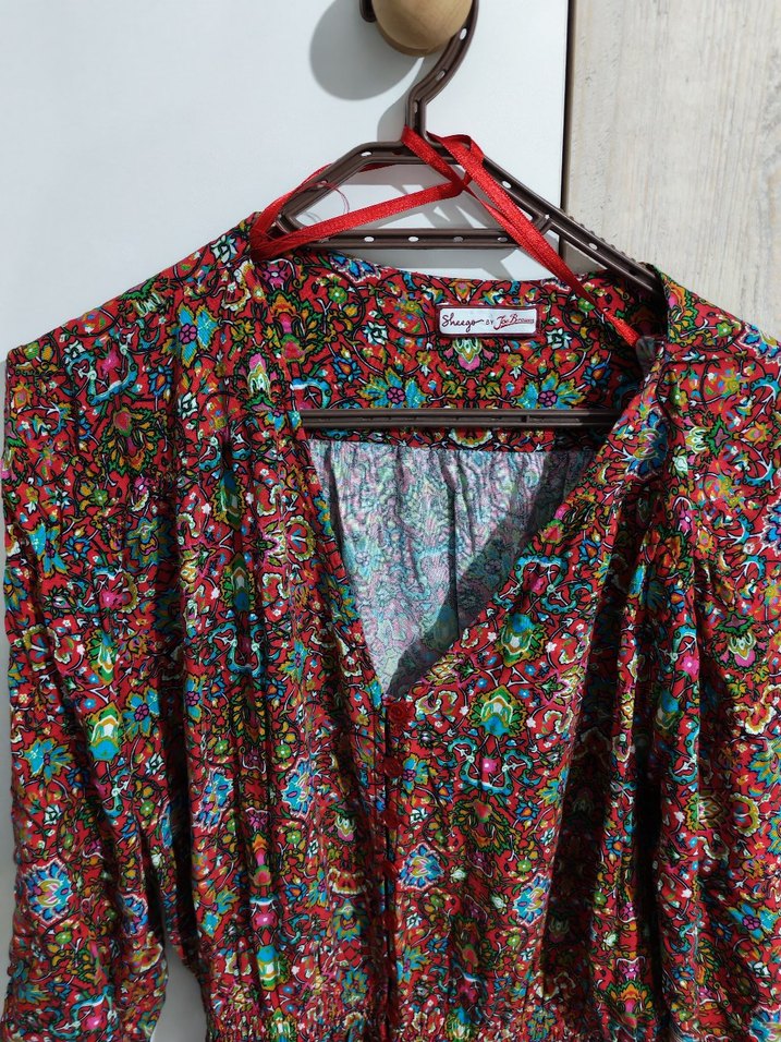 Renkli desenli, V yakalı ve uzun kollu bol kesim elbise . Yumuşak dokulu tekstil kumaştan üretilmiştir, günlük kullanım için uygundur.