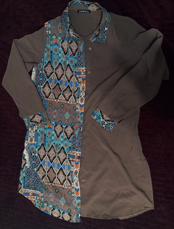 Bohem tarzda, uzun kollu ve yakalı, düğmeli hamile tunik. Tek tarafı desenli, diğer tarafı düz koyu renkli kumaştan, rahat kesim. Günlük kullanım için uygun.
