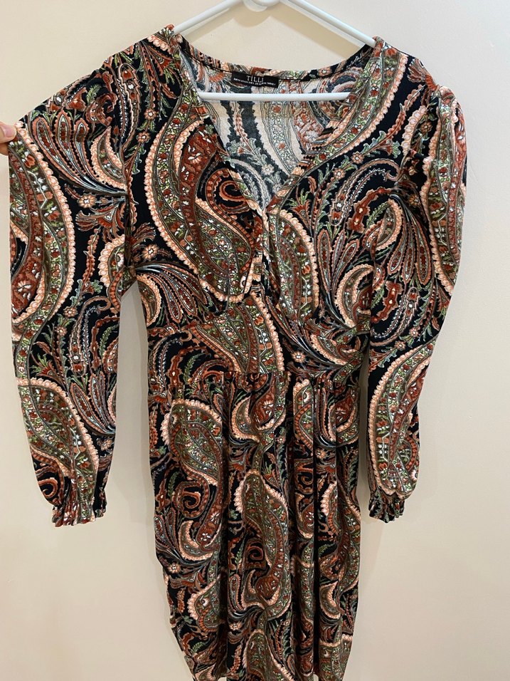 Desenli Bohem Uzun Kollu V Yaka Elbise