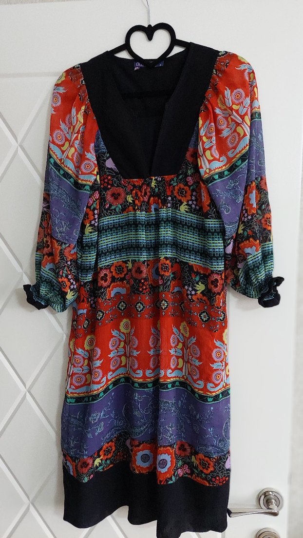bol kesim, çok renkli desenli bohem elbise, V yaka ve uzun drapeli kollara sahiptir, günlük kullanıma uygundur.