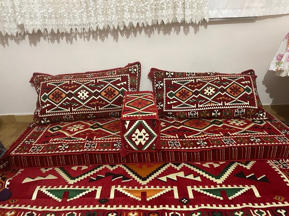 Desenli bordo yastık ve kılıflardan oluşan klasik set, zengin geometrik motiflerle süslenmiştir. Koyu bordo renk mekâna sıcaklık katar. ️