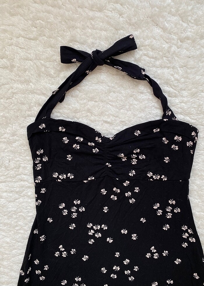 Orta boy pamuk kumaş kelebek desenli boyundan bağlamalı elbise. XS -S beden için uygundur. Pasajdan alındı