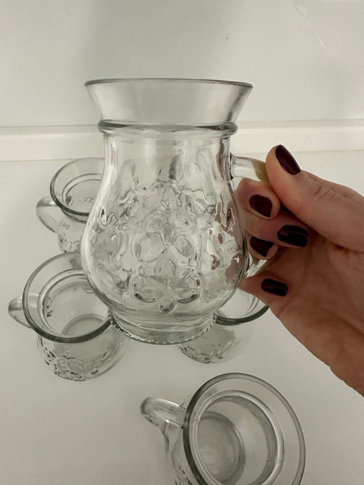 Desenli bardaklardan oluşan set, klasik bir dokunuşla ayran ve meşrubat sunumu için uygundur.