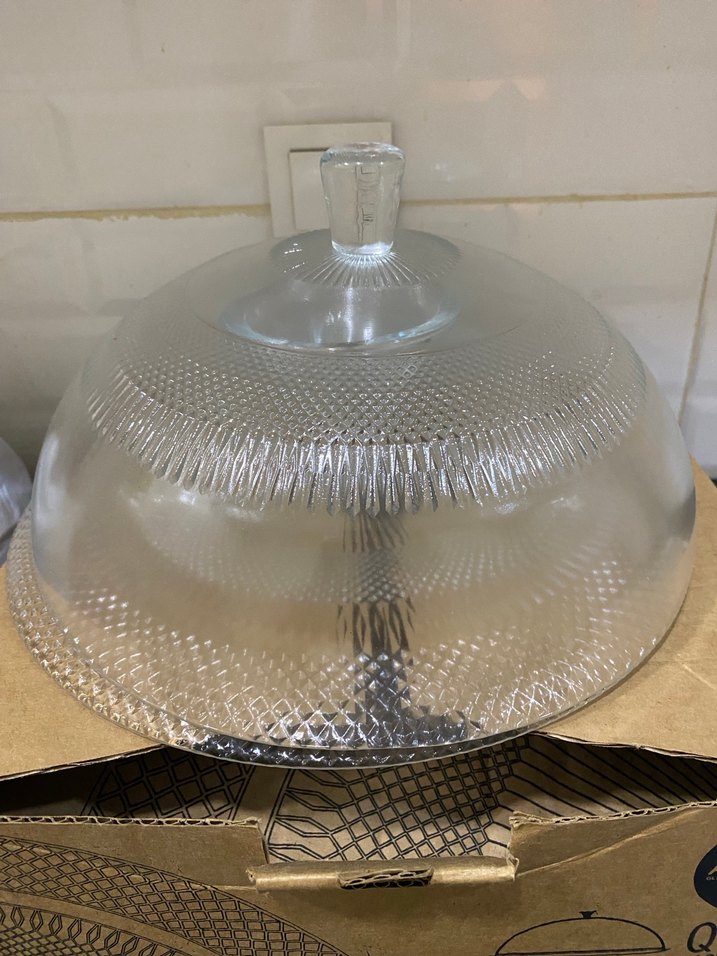 Yılan desenli, açık gri renkte klasik tarzda cam kapaklı servis tabağı. Üstünde cam tutacağı bulunur. ️