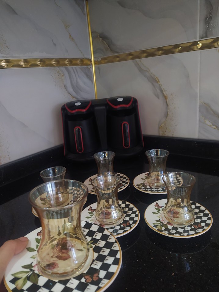 Desenli tabaklar ve ince belli çay bardaklarından oluşan set, bej tonlarıyla klasik bir hava katıyor.