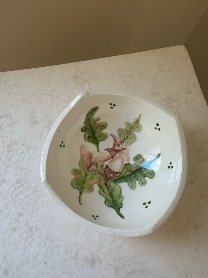 Yeşil yaprak desenli beyaz seramik tabak, doğadan esinlenen sade bir tasarıma sahiptir. El emeğidir. Çini malzemeden üretilmiştir. Sırlanıp fırınlanmıştır. Gıdaya uygundur.