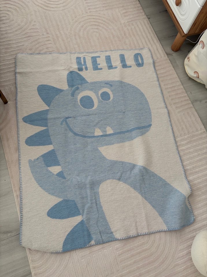 Gri renkte, üzerinde "HELLO" yazısı ve dinozor baskısı bulunan yumuşak ve sıcak çocuk battaniyesi.