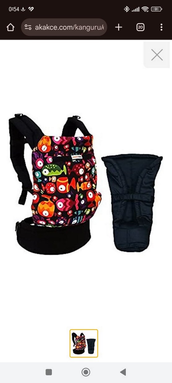 Ayarlanabilir askılı, yastıklı destekli çok renkli bebek kangurusu. Canlı balık desenli ve ekstra konfor için çıkarılabilir siyah ek parça içerir. 3 kez kullanıldı. Yıkamadan dolayı renginde biraz solma mevcut.
