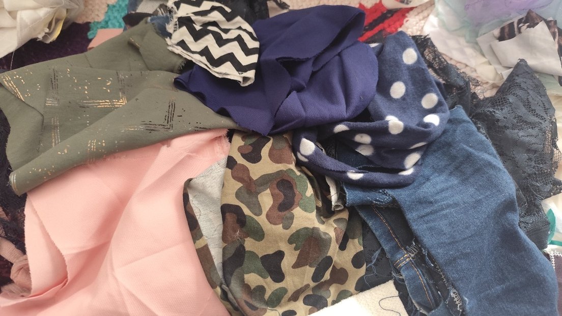 Drapeli tasarıma sahip, çok renkli ve koyu desenli, #barbi#toka yapılabilir küçük kumaş parçaları penye, kumascesitli