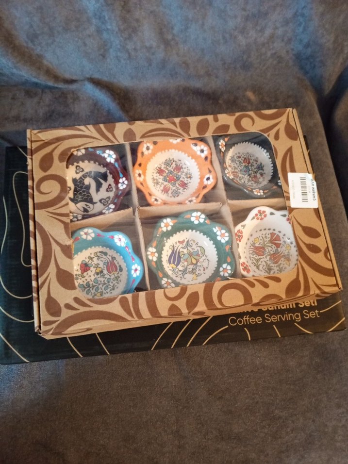 Çeşitli koyu ve canlı renklerde, geleneksel desenlere sahip altı parçalı çerezlik servis seti. ☕