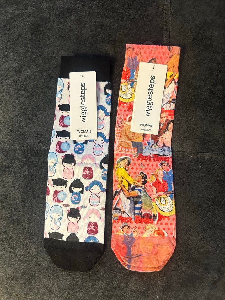 Sentetik kumaştan, koyu ve canlı renklerde, baskılı desenlere sahip iki çift çorap seti.