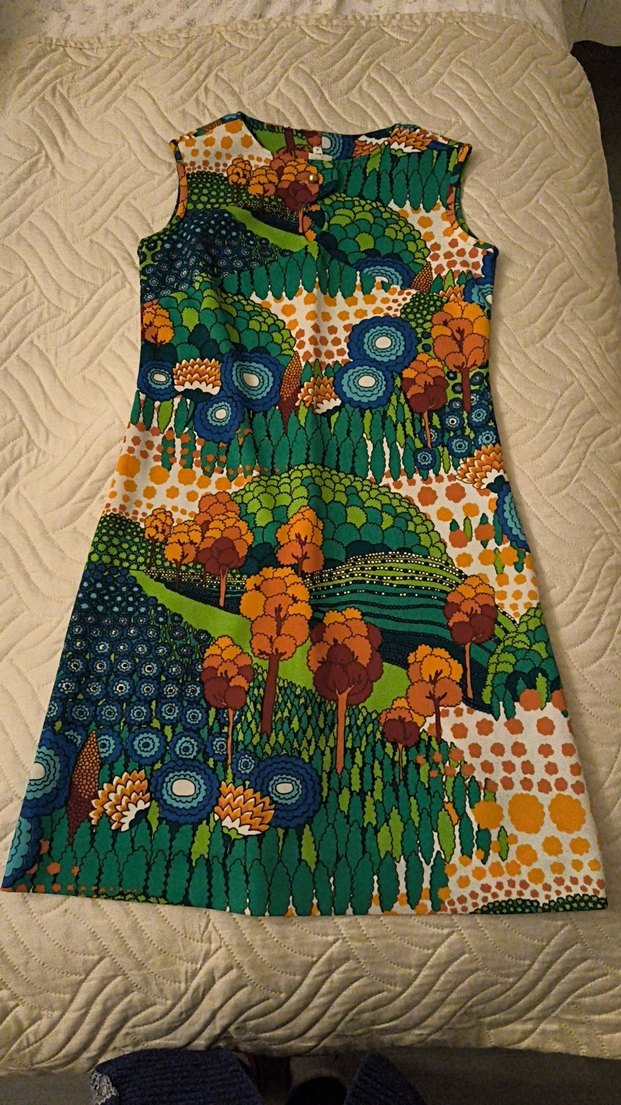 Çok renkli ve desenli, koyu canlı tonlarda doğa temalı motiflerle süslenmiş elbise