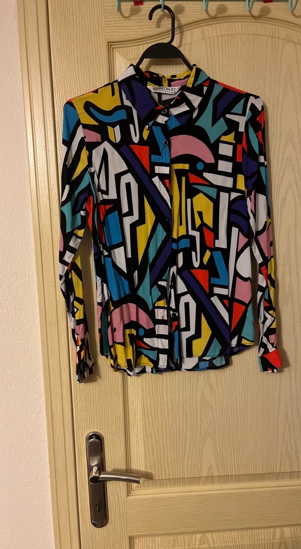 Farklı renklerde, desenli, uzun kollu ve yakalı, sentetik kumaştan kadın gömleği. Belinde tokalı detaylar bulunur, sokak modasına uygundur.