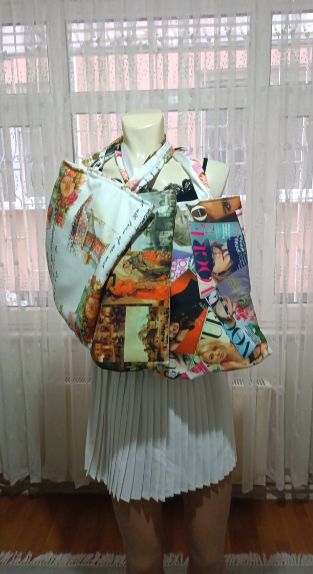 Kadınlar için çok renkli, desenli ve hafif sentetik kumaştan yapılmış omuz çantası. Günlük kullanım için drapeli ve Paris sokak modasına uygun.