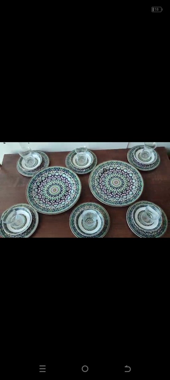 Koyu tonlarda, çok renkli ve desenli tabaklarla birlikte cam bardaklar içeren klasik yemek takımı. Sofralarınıza şık bir dokunuş katar. ️ 6 adet tatlı tabak 6 adet çay tabak 6 adet bardak