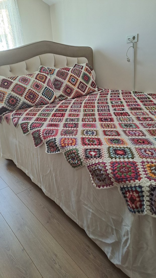 Hafif ve çok renkli desenli bu örgü battaniye, canlı kare desenleriyle her yatağa sıcaklık katıyor. ️