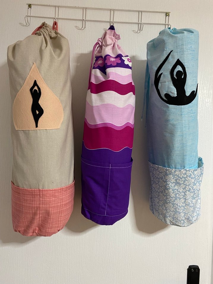 Pastel çok renkli, desenli yoga kayış çantaları, yumuşak kumaş ve kolay taşınabilir ipli kapama ile.