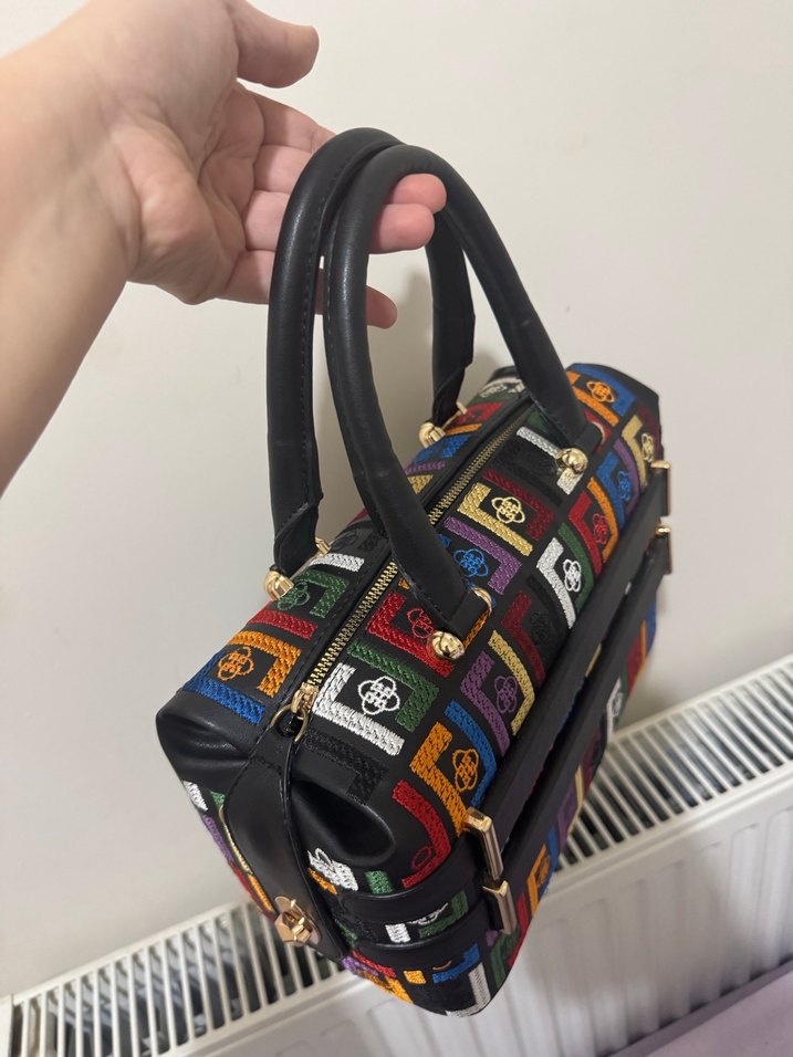 Bu kadın çantası koyu renkli, çok renkli desenli deriden yapılmıştır Bohem ve retro sokak modasına uygundur.