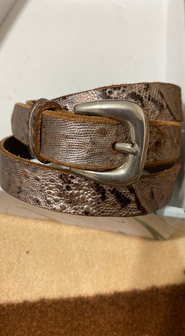 Bohem tarzda, vintage dokulu kahverengi deri kadın kemeri, gümüş tokasıyla retro bir hava katıyor. Uzunluk 106 cm -en 2 cm