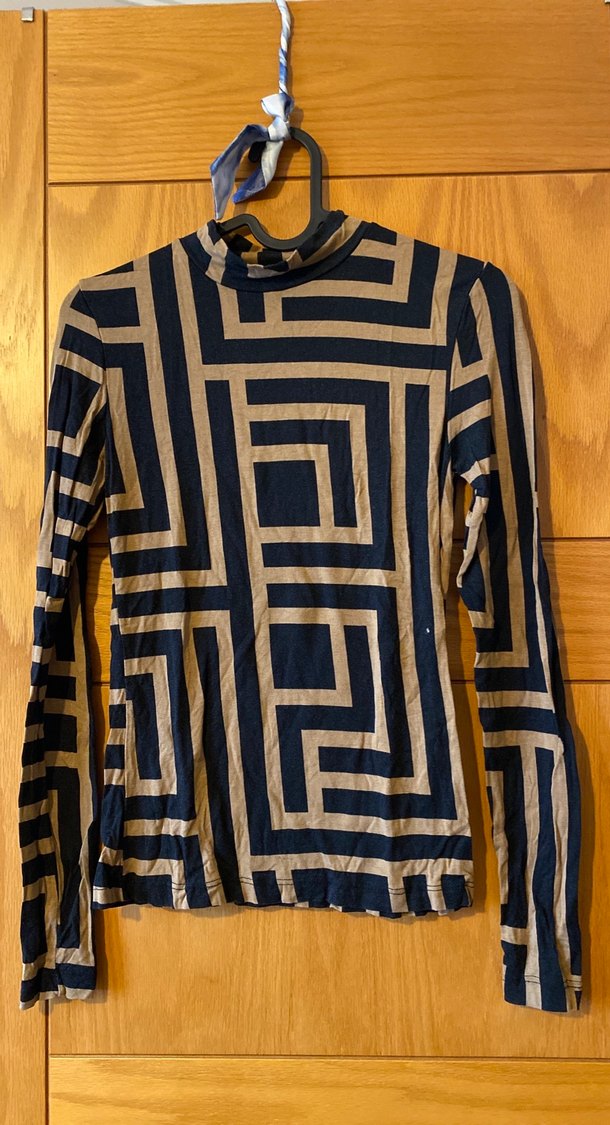 Fitted kesim, uzun kollu, dik yakalı kadın bluz, cesur geometrik desenlidir. Penye kumaştan üretilmiş, kahve ve siyah renklerle ofis kullanımı için uygundur.
