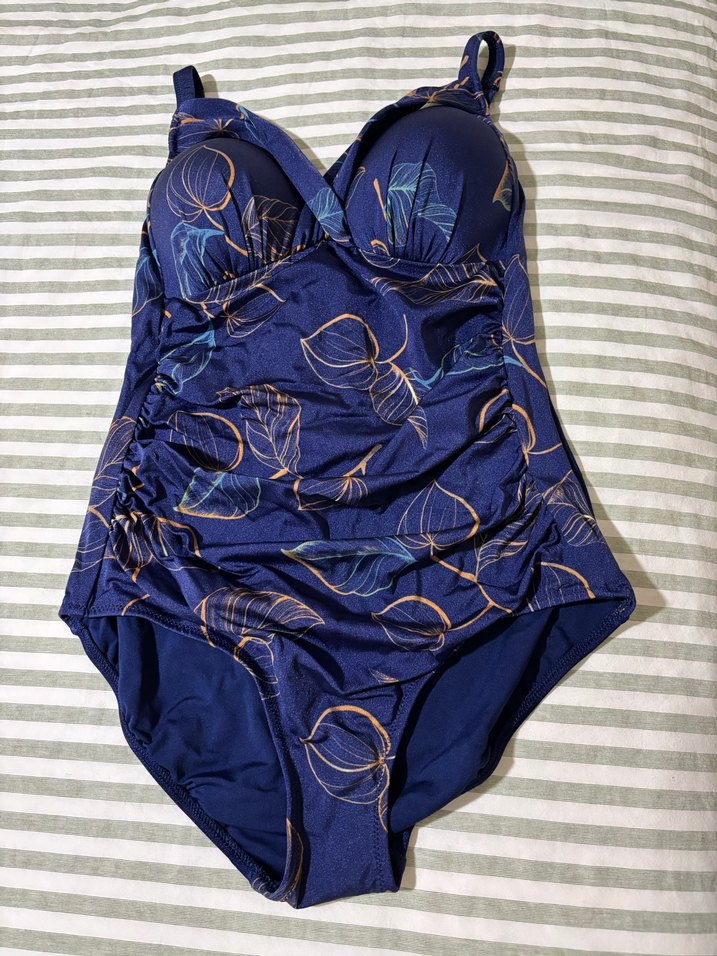 Lacivert renkte, drapeli ve desenli, askılı, vücuda oturan kesime sahip kadın mayo. Güncel tarzda, midi boy ve athleisure etkisiyle plaj için uygun.DAGİ MARKA