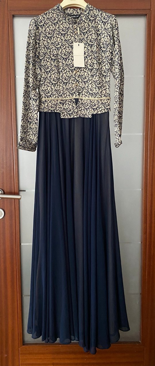Desenli üst kısmı drapeli detaylarla tamamlanan, uzun lacivert etekli, uzun kollu, klasik Paris tarzı modern abiye elbise.