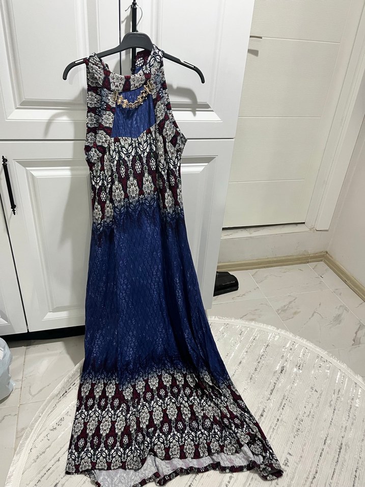 Desenli Drapeli Lacivert Uzun Bohem Elbise