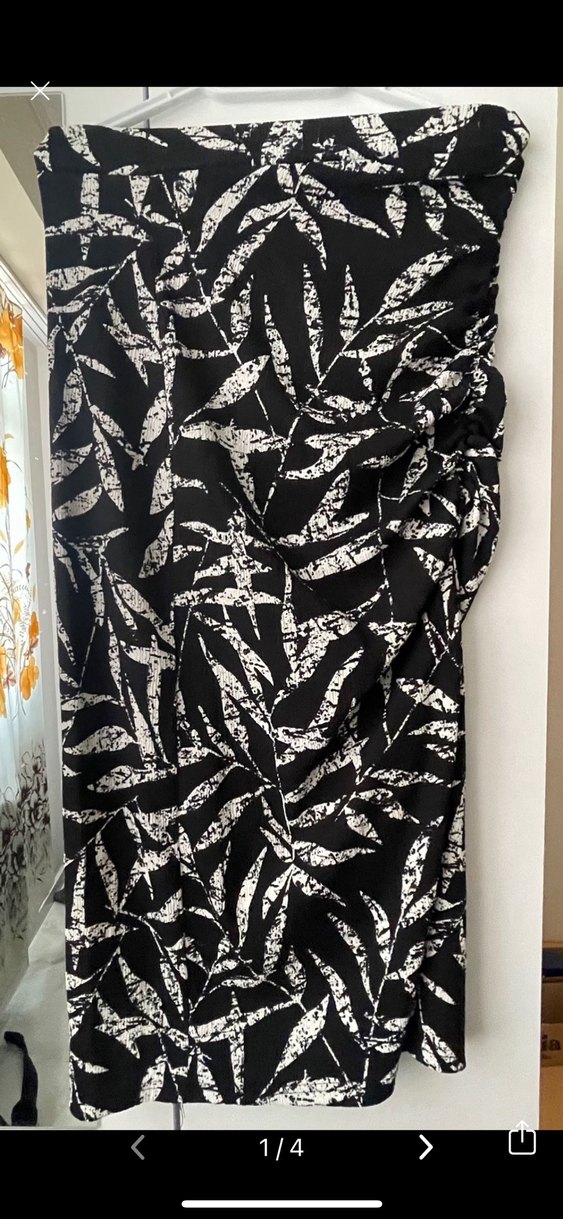 Drapeli ve desenli siyah beyaz sentetik kumaştan, dar kesim uzun hamile eteği. Minimalist, avangart sokak modasına uygun, günlük kullanıma uygun.