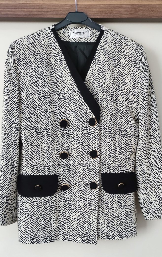 Kadın blazer, çentikli yaka ve düğmeli ön detayına sahiptir. Siyah ve beyaz desenli, uzun kollu ve kısa kesimdir. Sentetik kumaştan üretilmiştir, ofis ve sokak stili için uygundur.