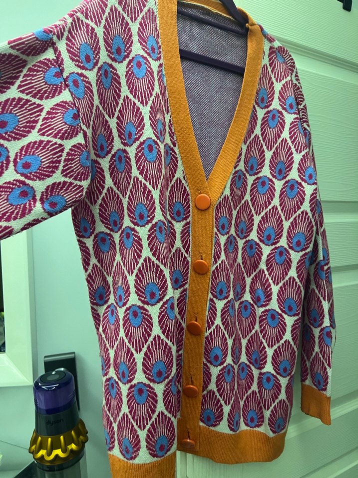 Renkli, desenli ve düğmeli kadın hırka. V yaka, uzun kollu ve bol kesimdir. Günlük kullanıma uygun bohem vintage tarzda.