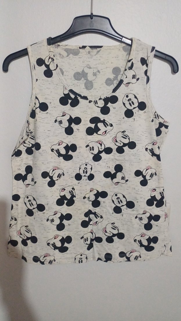 Pamuklu, kolsuz, düğmeli ve baskılı Mickey Mouse desenli, rahat kesim, yuvarlak yaka kadın tişörtü. Günlük sokak stili için uygundur.