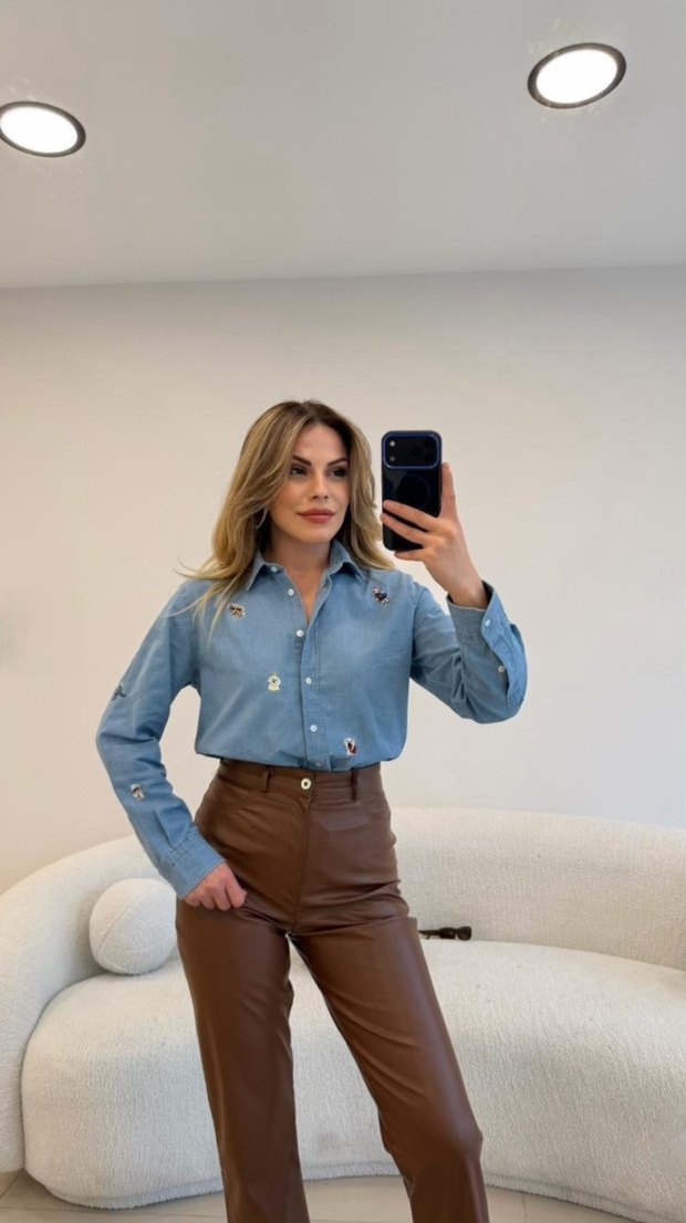 Mavi renkli denim gömlek, uzun kollu ve yakası kesimli. Düğmeli ve desenli detaylara sahip, ofis için uygun. İstediğiniz tüm bedenler mevcuttur S M L XL