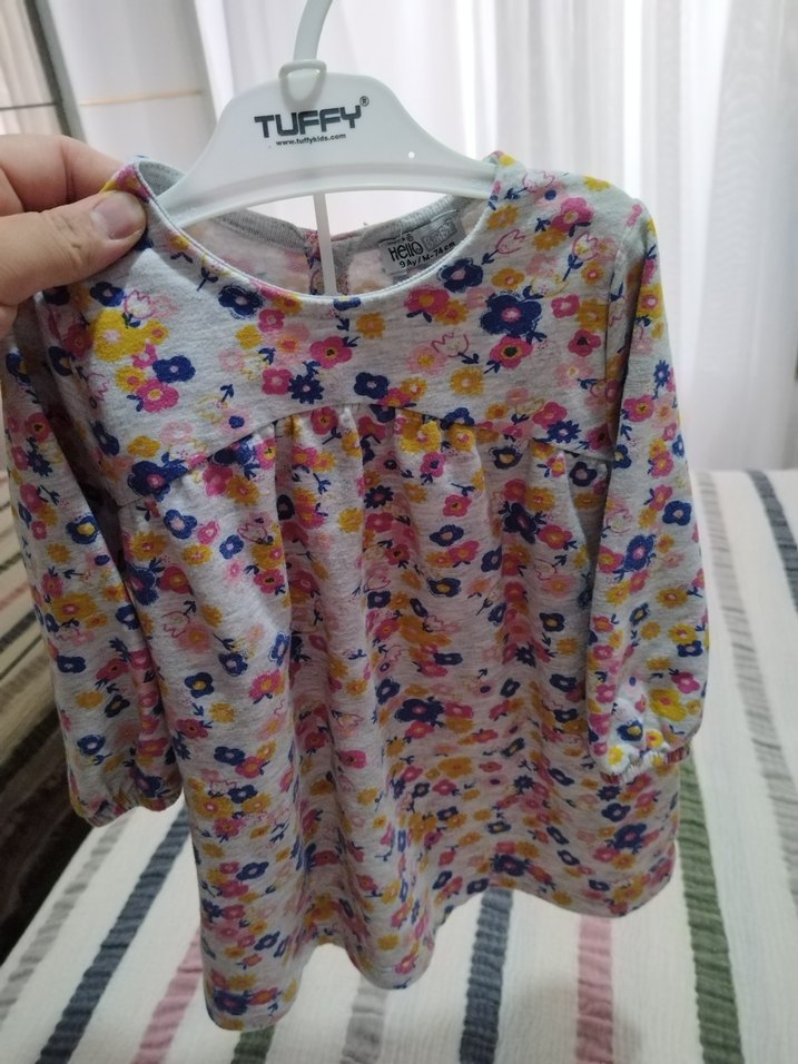 Rahat kesim, uzun kollu ve yuvarlak yakalı elbise. Çok renkli çiçek desenli ve düğme detaylı, yumuşak kumaştan üretilmiştir.