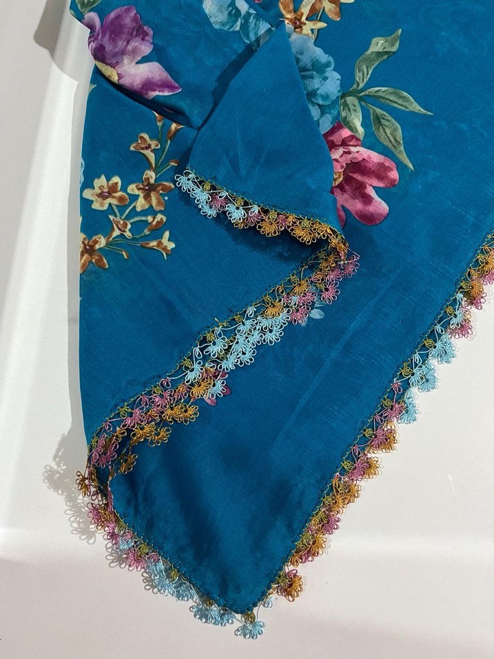 Mavi renginde, renkli çiçek desenleri ve ince dantel detayına sahip bohem tarzda kadın şalıdır. Retro ve hippie havası katar.
