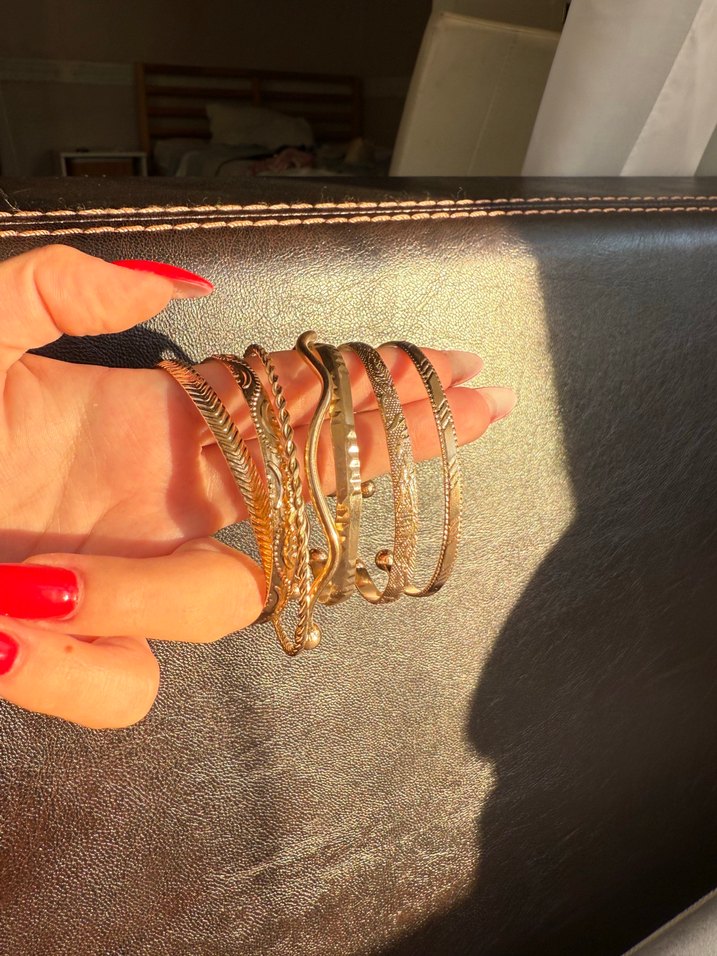 Desenli elastik, parlak altın renkli bileklikler, bohem tarzıyla günlük kullanıma uygun, göz alıcı bir şıklık sunar. 7li altın rengi bileklik seti. Sıfır ve paketli olarak gönderilecektir.