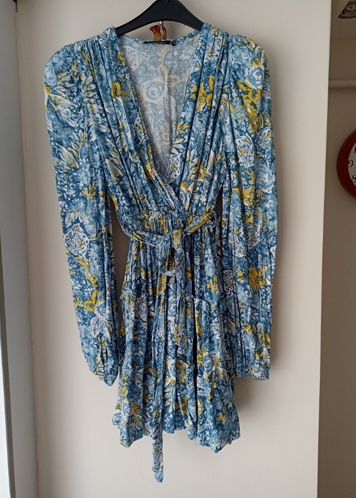 Omuzları vatkalı v yaka beli lastikli kemerli yaz için ideal rahat ve şık elbise