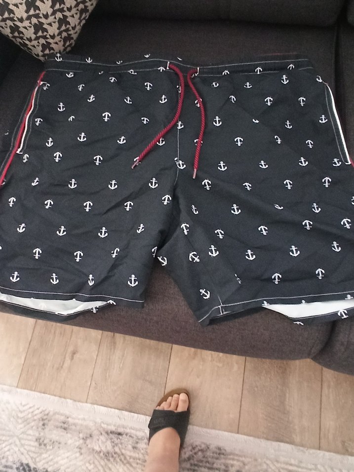 lacivert beyaz çapa desenli, bol kesim erkek midi mayo. Kırmızı bağcıkdetaylara sahip, rahat ve gündelik tarzda.