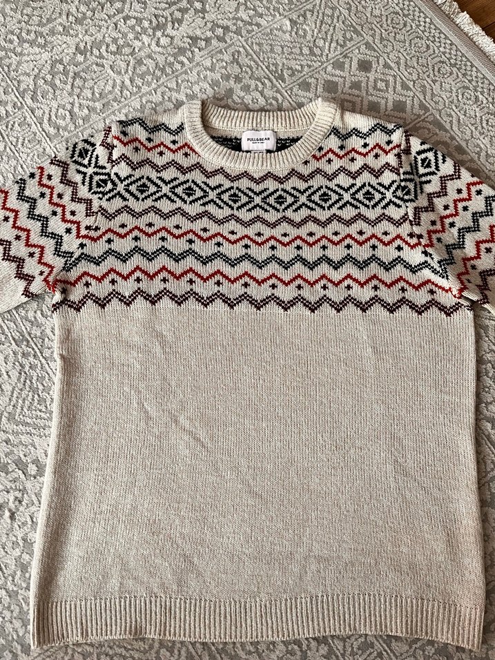 Bej renkli, bisiklet yakalı ve uzun kollu örme erkek kazak. Üst kısmında desenli tasarım bulunur, rahat kesimlidir. Günlük kullanıma uygundur.