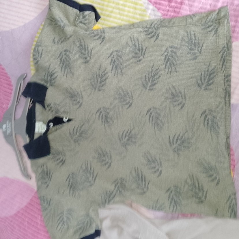 yeşil renkli, yaprak desenli erkek polo tişört, kısa kollu, bol kesim ve düğmeli V yaka ile günlük rahat stil için uygundur.